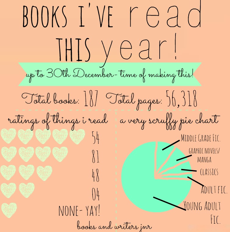 Hopefully that’s all the things covered! ;D I quite enjoyed making those infographic thingies so maybe I’ll do more posts like this for different subjects soon… I’m really happy with this year bookish-blogging wise. Again- big thank yous and hugs and virtual cake to all of the lovely authors and publishers I’ve read books from! It’s been awesome meeting lots of new people, too. I’m looking forward to meeting more people and reading more books and carrying on with blogging in 2014!