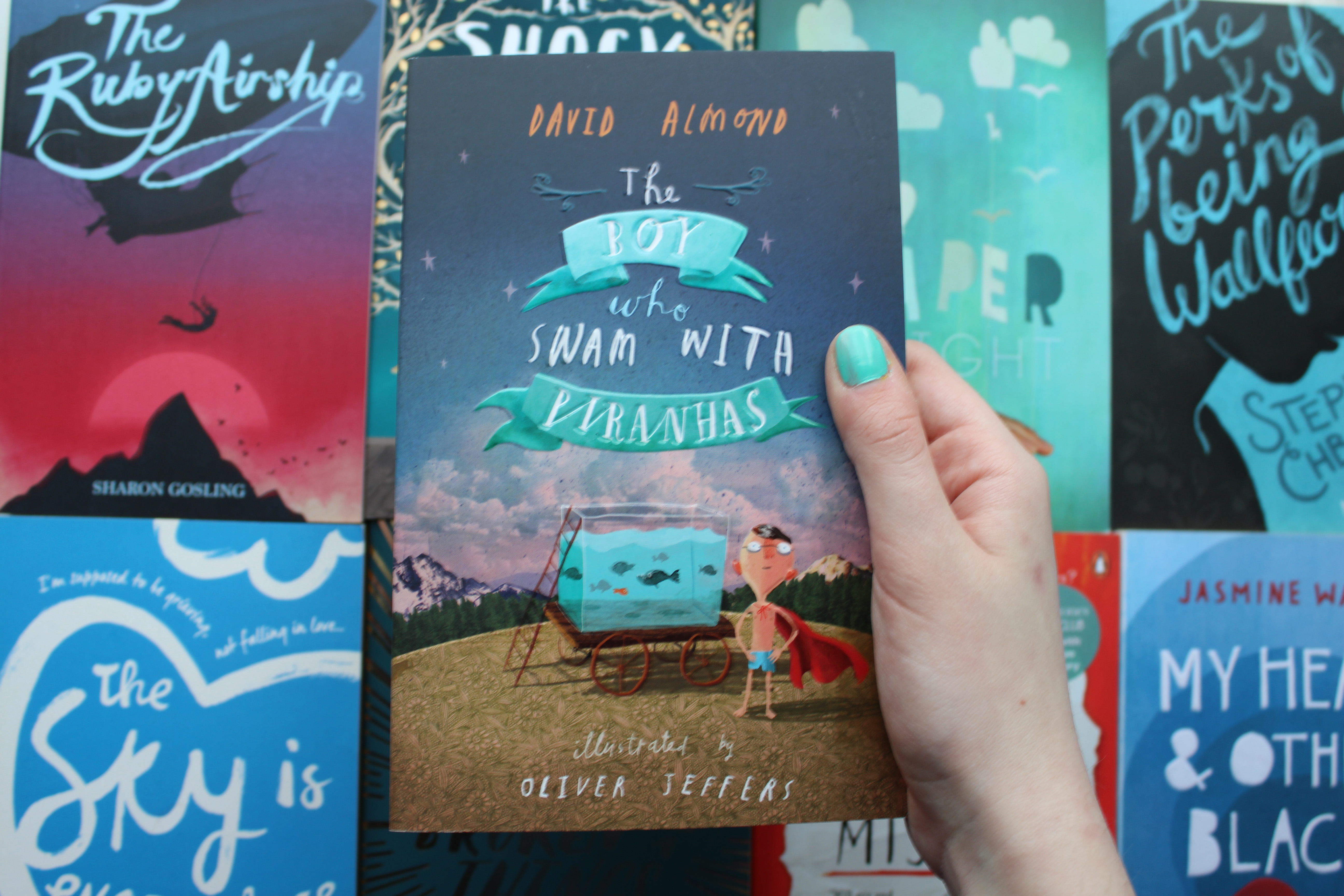 First up – The boy Who Swam with Piranhas. This book is illustrated and designed by Oliver Jeffers, who is one of my favourite illustrators. The title is in his handwriting and I just love it so much. I don’t really know how to describe it properly – I just adore the uneven capitals and childlike joined-up letters. It’s really pretty!