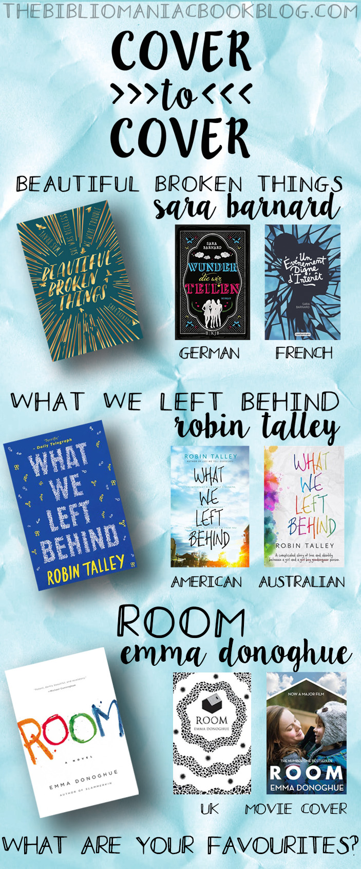 I love books with brush fonts on the cover, as I think they’re really pretty, so that’s probably why I was so drawn to most of these. Another thing I love to see with book covers is how an artist interprets the theme of the book – for What We Left Behind, an LGBT* romance story, the English edition incorporates lots of small gender symbols, whilst the Australian version is a colourful rainbow. And with Beautiful Broken Things, the French edition’s cover design is a nod to a pivotal point in the story, and I think it’s presented really cleverly.