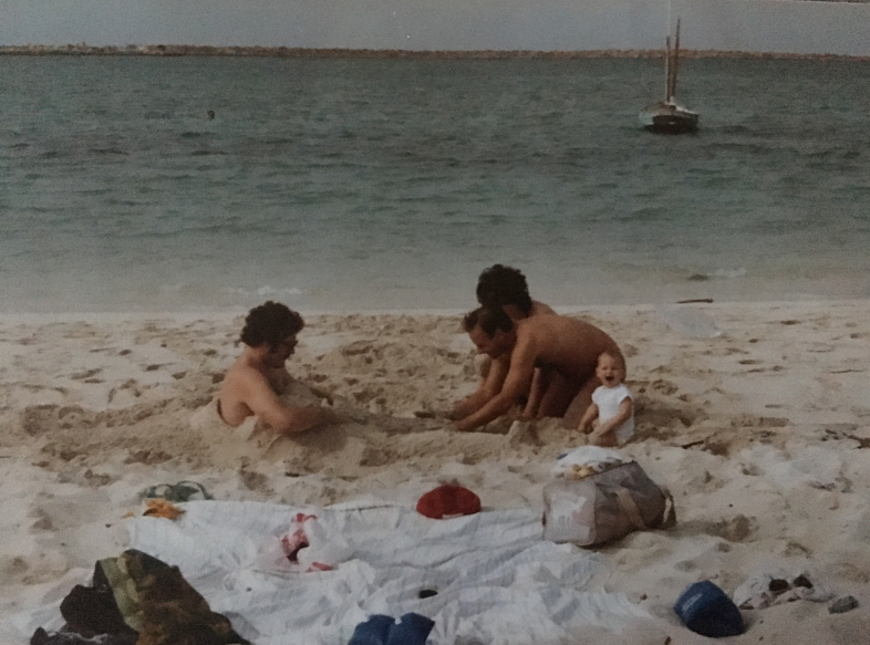 1. I was born out in Abu Dhabi, in the United Arab Emirates, where my Dad was working at the time. (That’s him, burying a friend on the beach for my amusement.) Apparently I really liked to dip sausages in the sand to eat them, and chasing cockroaches down the corridors of our building.