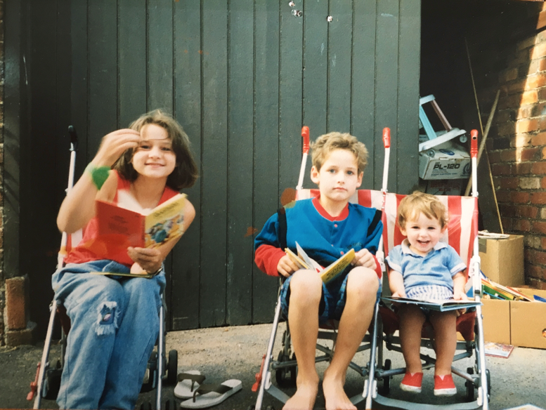 3. When I was eight, we moved home to Wales again in order to be closer to family, just before my youngest brother was born. Because the house we were supposed to be buying fell through, we ended up living with my grandparents (at their home, known as HQ) for a full year before moving into our new house. Here I am with both my brothers, outside our new home, sorting through boxes of books we’d been storing in the garage.